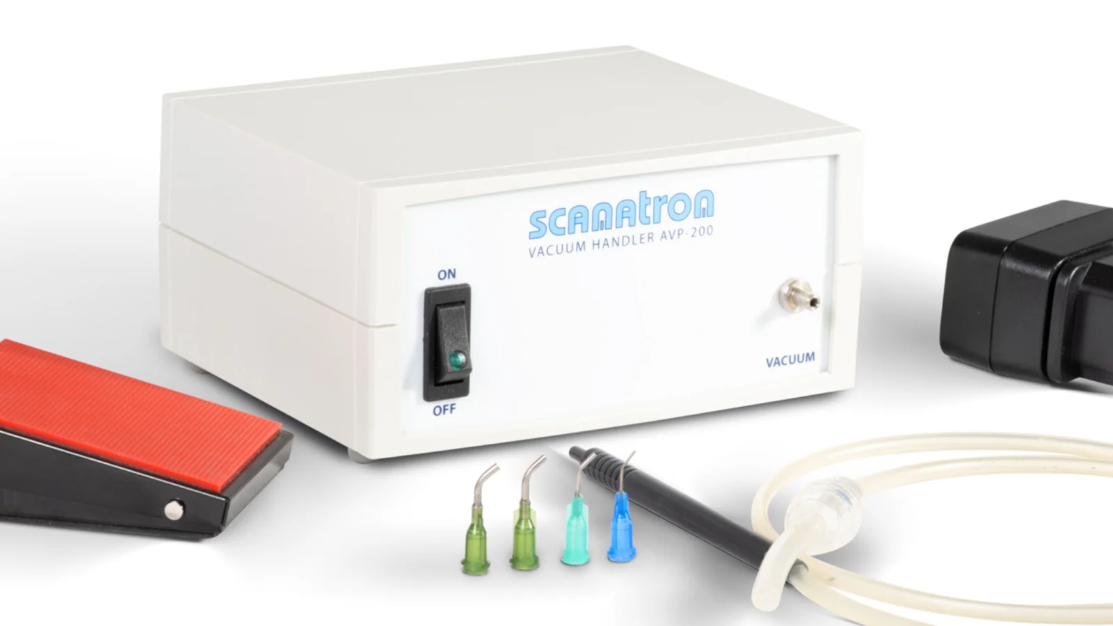 Der Vacuum Handler AVP-200 wird mit Zubehör für den sofortigen Einsatz ausgeliefert, einschliesslich einem Set mit Standard-Nadeln und einem Saugnapf. Sogar ein internationales Netzteil mit austauschbarem Stecker ist im Paket mit dabei.
